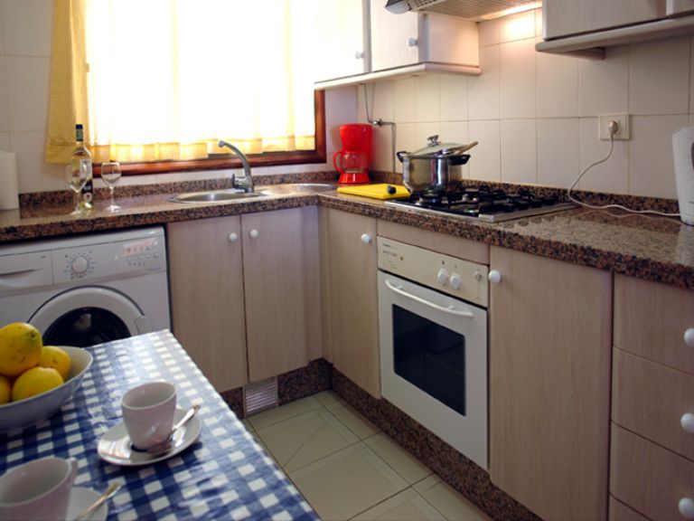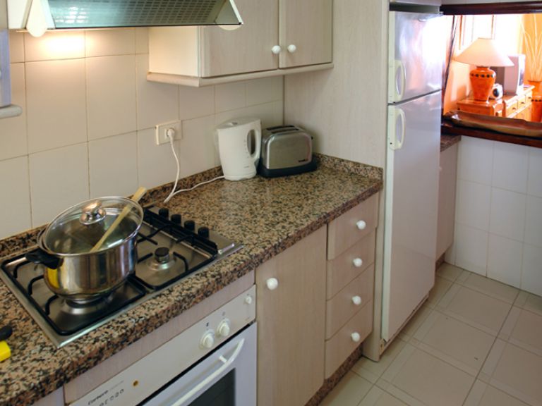 | An das Wohnzimmer grenzt die moderne Einbauküche mit Granitarbeitsplatte an, die mit einem vierflammigen Gasherd, Backofen, Toaster, Kaffemaschine, Wasserkocher und Waschmaschine ausgestattet ist. Außerdem befindet sich auf dieser Etage noch ein Gäste - WC. | ||