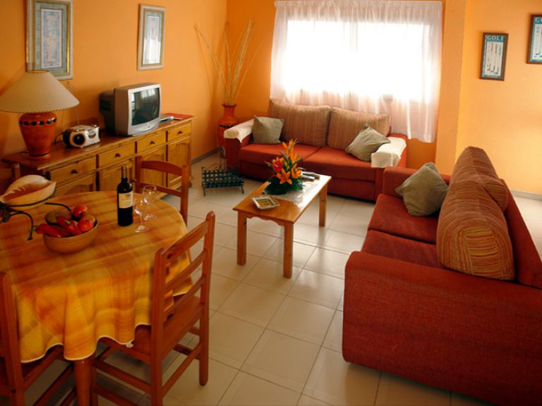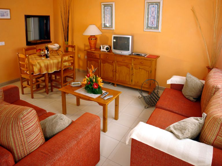 | In der 1. Etage liegt das gemütliche Wohnzimmer mit integrierter Essecke und Zugang zum ersten Balkon. Es ist mit zwei bequemen Sofas, einem Esstisch und einem Fernsehgerät (auch deutsche Programme) ausgestattet und in hellen, freundlichen Farben gehalten. | ||