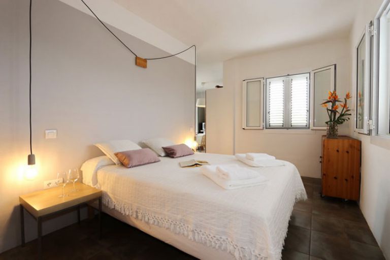 | Der Schlafbereich, der vom Wohnbereich durch eine freistehende Wand abgetrennt ist, verfügt über einen deckenhohen Kleiderschrank und ein Doppelbett mit durchgehender Matratze (160 x 190). | |||||