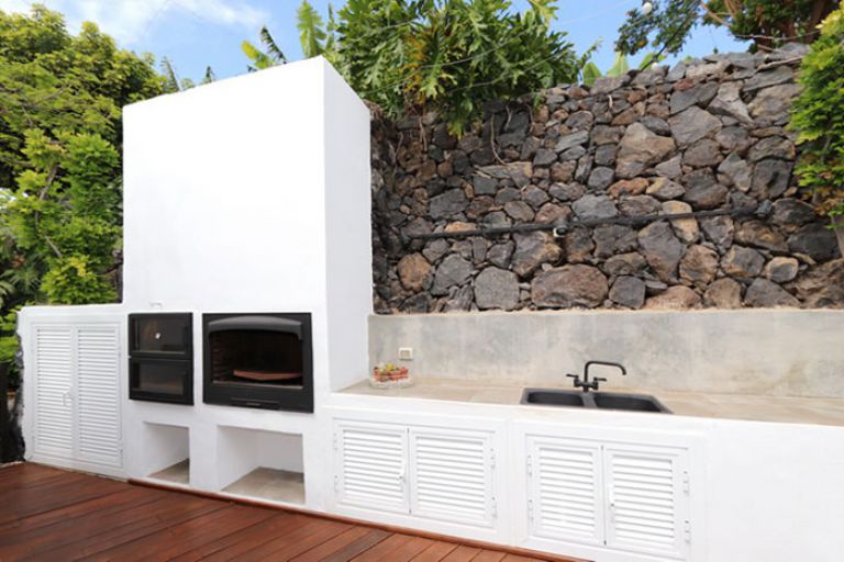 | Die 30 qm große Terrasse und der Gartenbereich sind mit Sitzmöbeln und Sonnenliegen ausgestattet. Direkt neben der Terrasse liegt die Außenküche mit einem gemauerten Grill und einem Backofen. | |||||