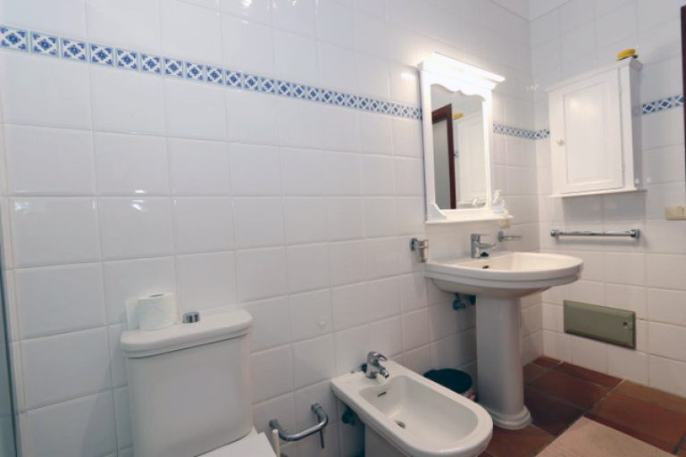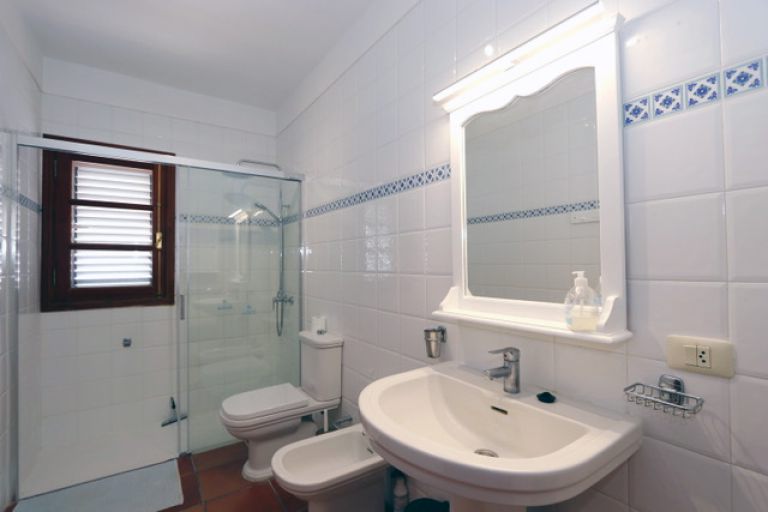 | Das Badezimmer mit Tageslichtfenster, verfügt über eine ebenerdige große Dusche, Waschbecken, WC und Bidet. | |||||