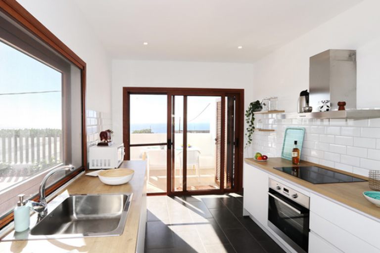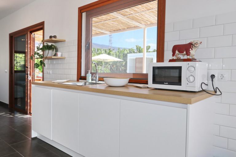 | Die moderne Küche mit Panoramafenster verfügt über einen Backofen, Geschirrspüler, Waschmaschine, Induktions-Kochfeld mit 4 Platten, eine große Kühlgefrierkombination, Kaffeemaschine, Mikrowelle, Wasserkocher und einen Toaster. | |||||