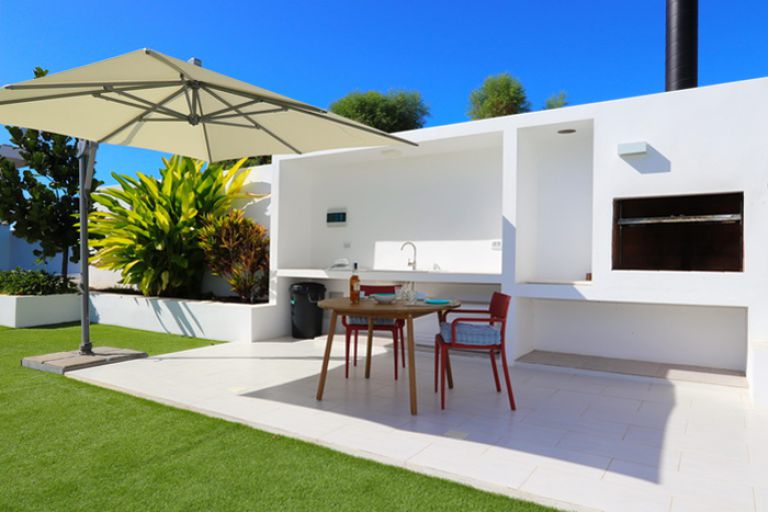 | Von der weitläufigen Terrasse mit Gartenmöbeln und Sonnenliegen aus können Sie traumhafte Sonnenuntergänge erleben. An die Terrasse schließt eine Außenküche mit einem gemauerten Grill an. |