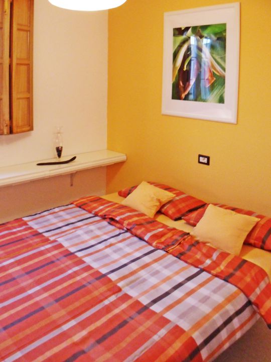 | Das Doppelbett im zweiten Schlafzimmer verfügt über eine feste Schaumstoffmatratze (160 x 200), einen kleinen Kleiderschrank und einen Deckenventilator. Das Badezimmer verfügt über Dusche, Waschbecken und WC. |