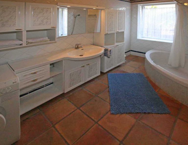 | Die beiden Badezimmer verfügen jeweils über eine Wanne, Dusche, Waschbecken und WC. In einem Badezimmer befindet sich die Waschmaschine. Der Tresor befindet sich im Abstellraum. | ||