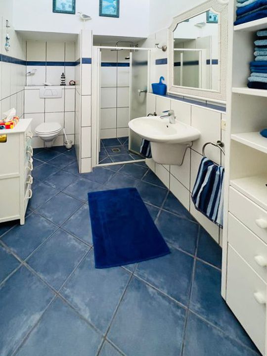 | Die Schlafzimmer sind jeweils mit einem Doppelbett (180 x 200) und einem geräumigen Einbauschrank möbliert. Ferner gibt es ein geräumiges Bad mit Dusche, WC und Waschtisch sowie einer Kommode und Badregal als Stauraum für Handtücher und Utensilien. Des weiteren ist ein ein separates Gäste - WC vorhanden. Badetücher, Geschirrtücher, Bettwäsche und Handtücher, Gartenmöbel, Sonnenliegen und eine Waschmaschine sind ebenfalls vorhanden. |