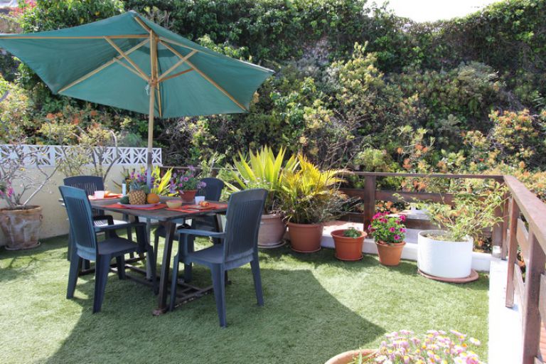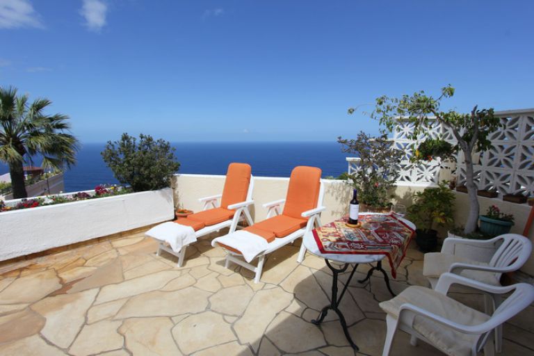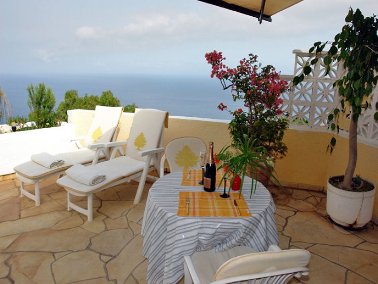 | Die Penthouse Ferienwohnung in El Sauzal liegt in der oberen Etage eines Reiheneckhauses mit eigenem Eingang und einem eigenen Pool, der nur von den Gästen des Penthouses benutzt wird. Hervorzuheben ist die außergewöhnliche Lage an der Steilküste mit einem traumhaften Blick auf den Atlantik, der nur ca. 100 m entfernt liegt, und auf die Nordküste von Teneriffa. Die Sonne scheint fast den ganzen Tag auf die Terrassen, vom frühen Vormittag bis zum Sonnenuntergang. | ||