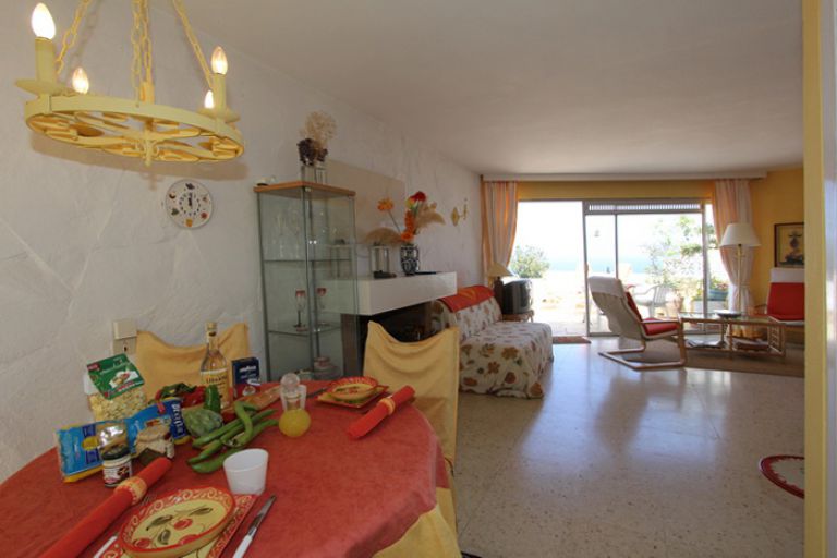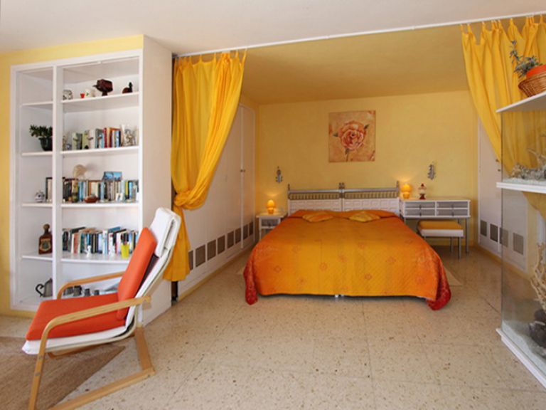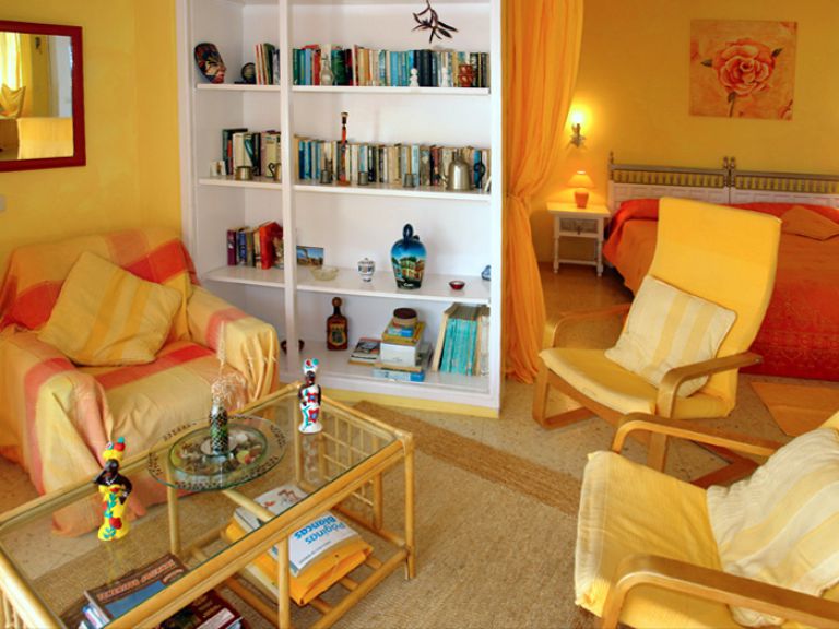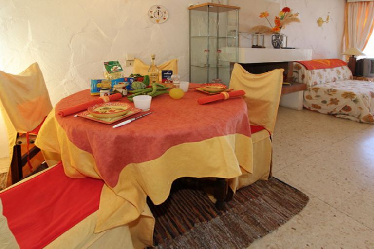 | Mit ca. 125 qm Wohninnen- und außenfläche ist das Penthouse für 2 Personen geeignet. Es ist einfach und zweckmäßig ausgestattet. Der Wohn- bzw. Schlafbereich im Studiostil ist ca. 60 qm groß und verfügt über einen offenen Kamin, gemütliche Sessel, ein Schlafsofa, SAT-TV, einen Eßtisch für vier Personen und ein Doppelbett mit Komfortmatratzen (2 x 90 x 200). Der Schlafbereich kann durch einen Vorhang abgetrennt werden. Die Küche ist komplett ausgestattet und bietet ein Zweiplatten Induktionskochfeld, einen kleinen Backofen, Kühlgefrierkombi, Toaster, Kaffeemaschine und Waschmaschine. Das Badezimmer bietet eine Dusche, WC und Waschbecken. | ||