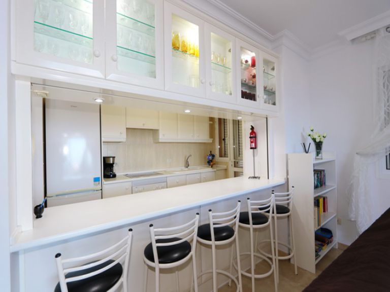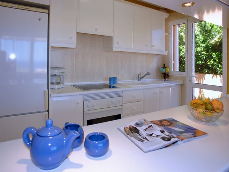 | Die zum Wohnraum hin offene Küche ist mit Backofen, Cerankochfeld, Kühlgefrierkombi, Mikrowelle, Toaster, Kaffeemaschine und Heißwassergerät ausgestattet. | ||