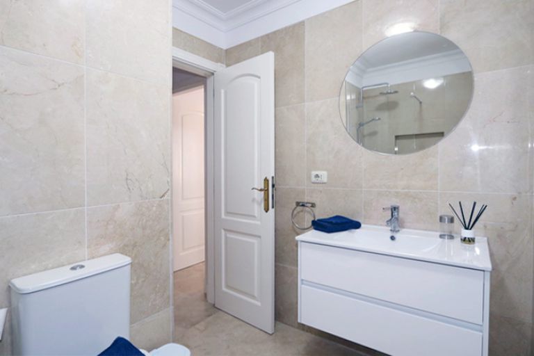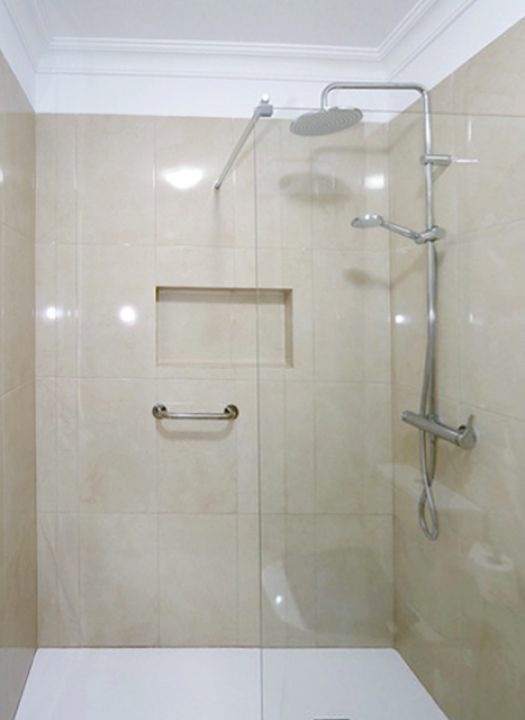 | Das moderne Badezimmer verfügt über eine ebenerdige, geräumige Dusche, großem Waschtisch und WC. | ||