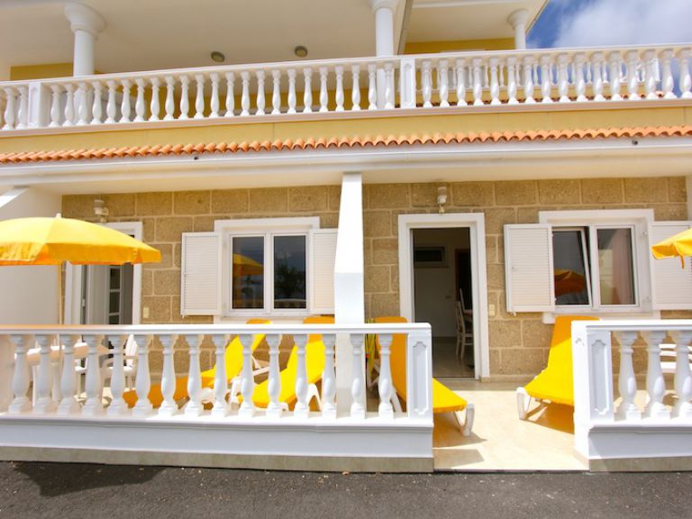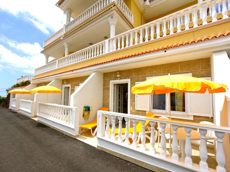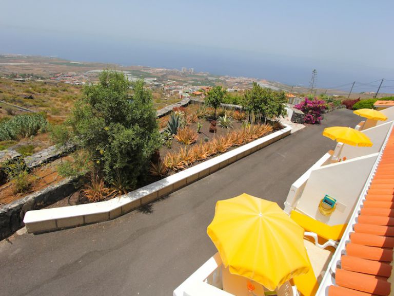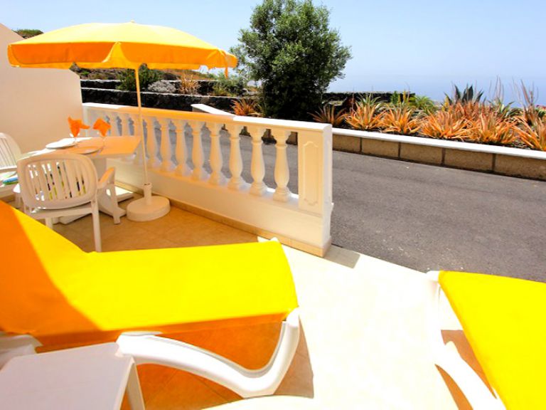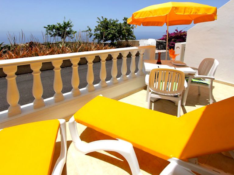 | Die zur Ferienwohnung gehörende Terrasse ist mit Gartenmöbeln, Sonnenliegen und einem Sonnenschirm ausgestattet. Genießen Sie die unverbaubare Aussicht auf den Atlantik mit der gegenüber liegenden Insel La Gomera und bewundern Sie abends das Lichtermeer von Los Cristianos und Playa de las Americas. | ||