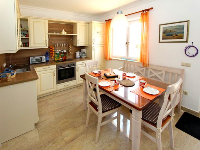 | Die moderne Einbauküche läßt keine Wünsche offen. Sie verfügt über Cerankochfeld, Backofen, Kühlgefrierkombination, Geschirrspülmaschine, Kaffeemaschine, Toaster, Heißwassergerät sowie sämtliches erforderliche Küchenzubehör. Der Essplatz ist integriert. | ||