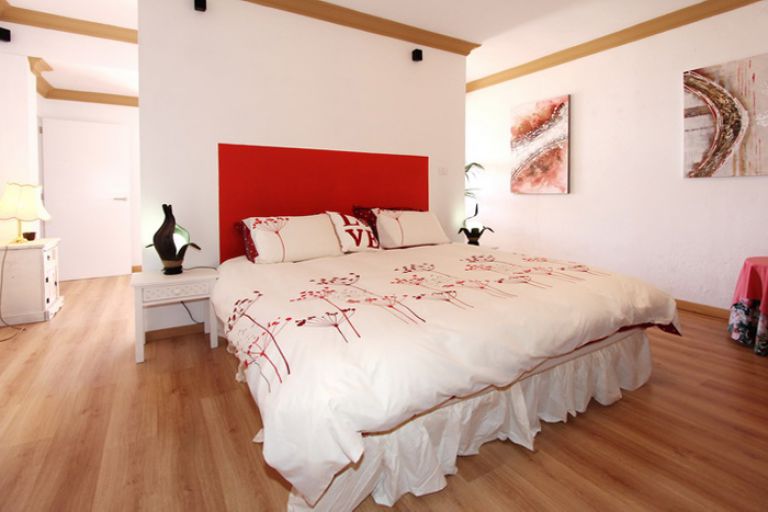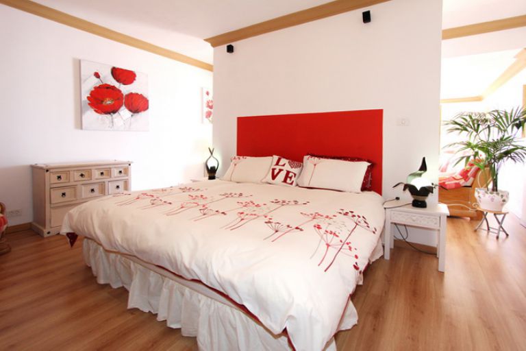 | Der vom Wohnzimmer optisch abgeteilte Schlafbereich ist mit einem großen und bequemen Doppelbett (200 x 200 cm / eine Matratze) sowie einem geräumigen deckenhohen verspiegelten Kleiderschrank ausgestattet. | ||