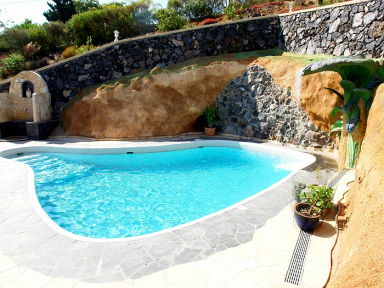 | Der Pool hat eine Größe von ca. 4 x 8 m und eine Wassertemperatur von ca. 28° im Sommer bzw. 24 ° im Winter. Erfrischen Sie sich unter der gemauerten Außendusche und bestaunen Sie den interessanten Wasserfall, der einer gemauerten Pflanze entspringt. | ||