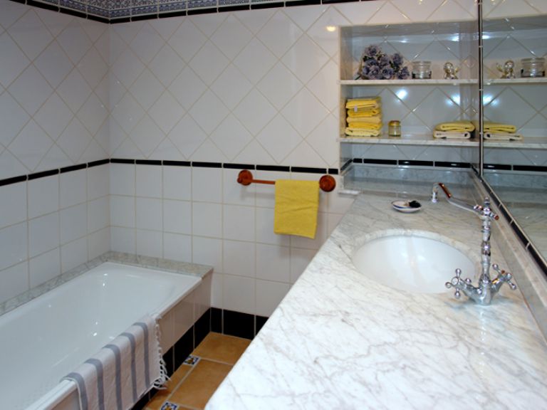 | Ein Badezimmer verfügt über eine Badewanne, das andere über eine Dusche. | |||||