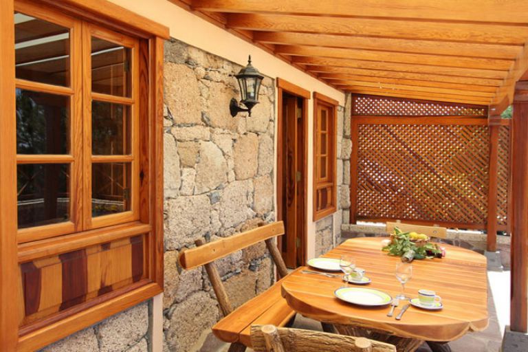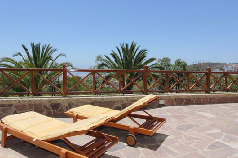 | Direkt vor dem Finca Haus befindet sich eine Terrasse mit Sonnenliegen und Gartenmöbeln aus Massivholz. Davor liegt ein großer Garten und der Stellplatz für den Mietwagen. | |||||