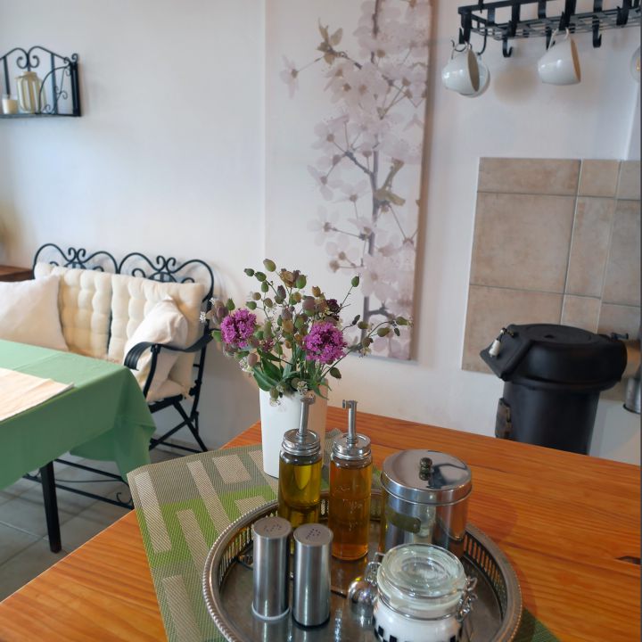 | Innerhalb des Wohnbereiches befindet sich die offene und voll ausgestattete Küche mit geräumiger Echtholz Arbeitsfläche. Neben Kochzubehör und Geschirr, verfügt die Küche über einen Herd mit Ceranfeld und Backofen, Kühlschrank, Kaffeemaschine, Toaster, Wasserkocher, Bratpfanne, Kuchenform sowie elektrischem Rührgerät. Direkt angrenzend der Essbereich, bestehend aus einem Tisch, gepolsterten Sitzmöbeln sowie einem kleinen Beistelltisch. Für behagliche Wärme sorgt der antike Ofen, der mit Holz befeuert werden kann. |