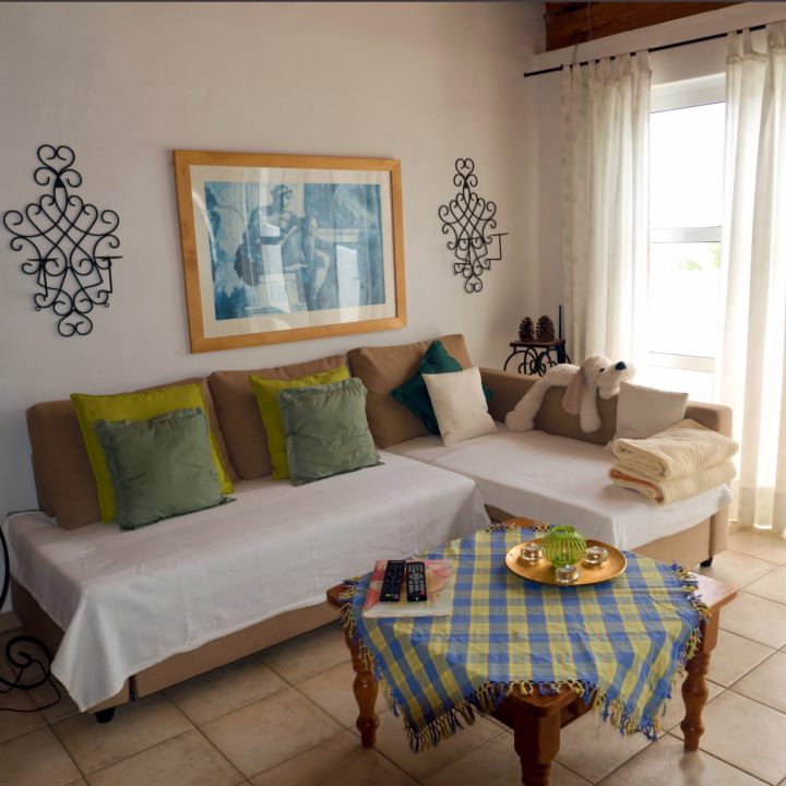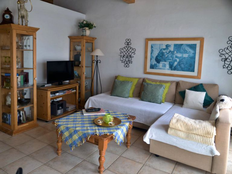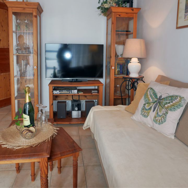 | Der Wohnbereich verfügt über ein geräumiges Sofa, welches auch als Schlafsofa für eine dritte Person, genutzt werden kann. Neben SAT-TV, Radio und CD-Player finden Sie hier auch Bücher und Gesellschaftsspiele. Der verfügbare Internetzugang ist kostenlos. Die Möbel aus massivem Holz schaffen eine gemütliche Atmosphäre. Die gesamte Ferienwohnung ist lichtdurchflutet und mit Bodenfliesen ausgestattet. |