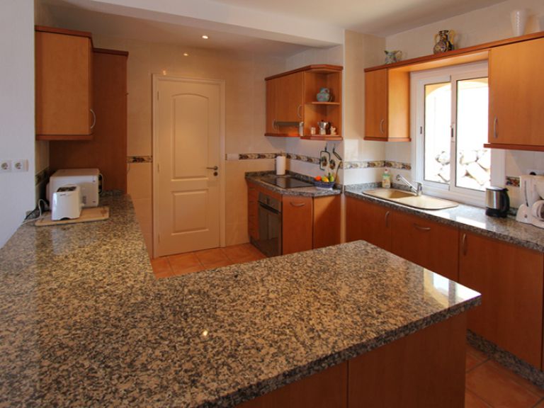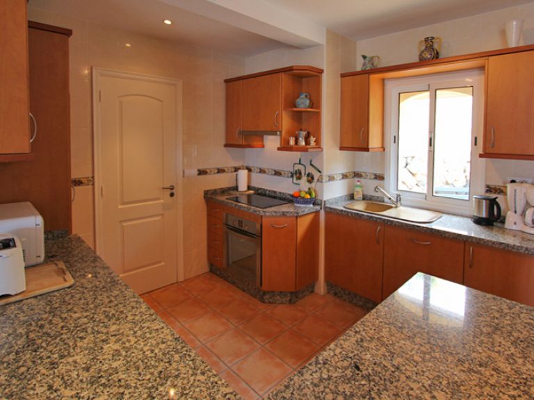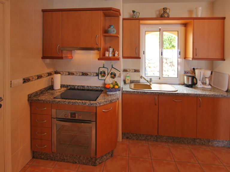 | Die moderne Einbauküche in Holzoptik mit Granitarbeitsplatte lässt keine Wünsche offen. Sie ist mit Cerankochfeld, Backofen, Mikrowelle, Kühlgefrierkombination, Geschirrspüler, Heißwassergerät, Toaster und Kaffeemaschine sowie sämtlichem erforderlichen Küchenzubehör ausgestattet. Außerdem sind Waschmaschine, Wäschetrockner, Bügelbrett und Bügeleisen vorhanden. |