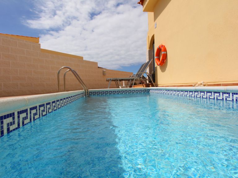 | Diese moderne und elegante Villa mit beheiztem Pool (2,50 x 4,00 / Tiefe 140 bis 180) läßt keine Wünsche offen. Die außergewöhnliche Lage, in Callao Salvaje, im fast immer sonnigen Südwesten Teneriffas, nur 20 m entfernt vom Atlantik, garantiert Ihnen Ruhe und ungetrübte Urlaubsfreude. In der Villa finden 4 Erwachsene und 2 Kinder bis zu 13 Jahren Platz. Die Villa liegt in einer verkehrsberuhigten Zone. Autos sind in der Sackgasse nur zum Be- und Entladen erlaubt. Der Parkplatz liegt ungefähr 120 Meter entfernt. |
