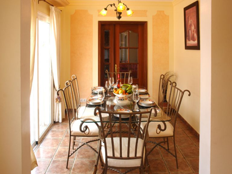 | Das lichtdurchflutete, elegante Esszimmer ist mit einem Glasesstisch möbliert und bietet Platz für 6 Personen. | |||||