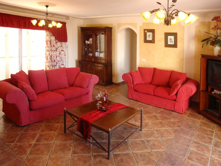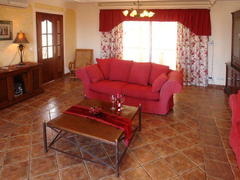 | Sie betreten die Villa durch eine große Eingangshalle. Das ca. 50 qm große geflieste Wohnzimmer ist mit zwei gemütlichen Doppelsitzer-Sofas, Schrank, Anrichte und SAT-TV für den digitalen Empfang von Fernseh- und Radioprogrammen möbliert. Für die Einrichtung wurde eine Innenarchitektin engagiert, die Möbel, Tapeten, Stoffe und Accessoires harmonisch aufeinander abgestimmt hat. | |||||
