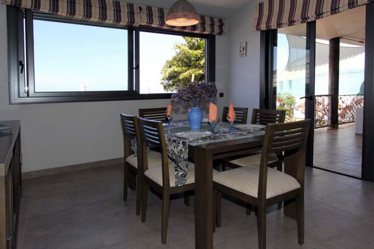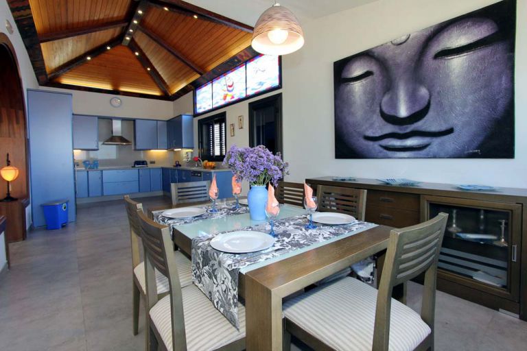 | Am Esstisch finden 6 Personen bequem Platz. Für das Ambiente dieser luxuriösen Villa ist eine Innenarchitektin verantwortlich, die mit viel Liebe zum Detail sämtliche Farben, Stoffe und Möbel harmonisch aufeinander abgestimmt hat. | |||||