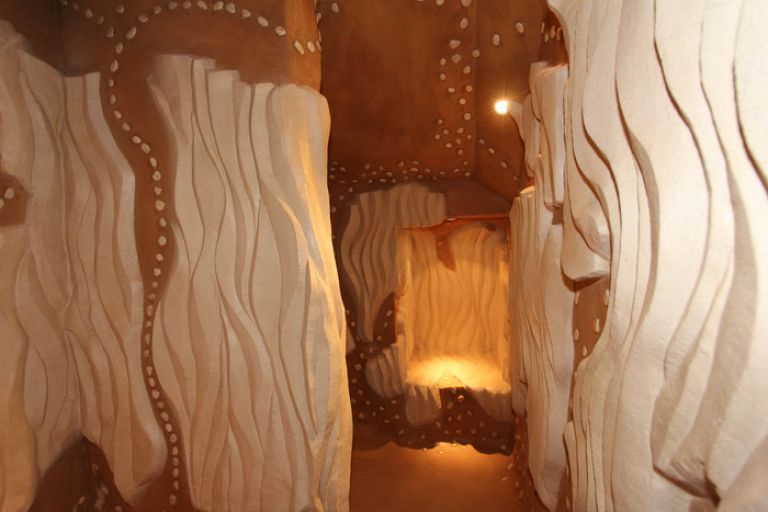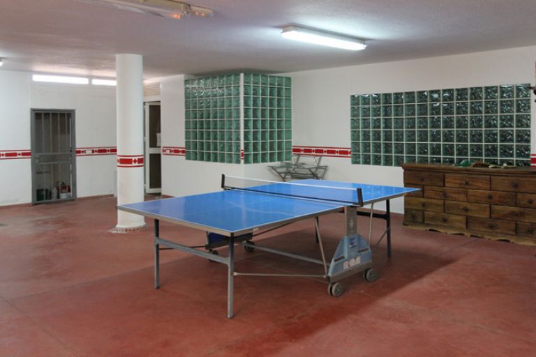 | Darüber hinaus gibt es eine Badmintonhalle, eine Tischtennisplatte und eine Dusche, die vom Design her an eine Höhle erinnert. Die Nutzung ist kostenlos, jedoch für Jugendliche unter 16 Jahre nur in Begleitung ihrer Eltern. In diesem Bereich befindet sich noch ein weiteres Bad mit Dusche und WC. Der Fitnessraum kann auch von den Gästen des Nachbarhauses TFS-081 genutzt werden. | |||||