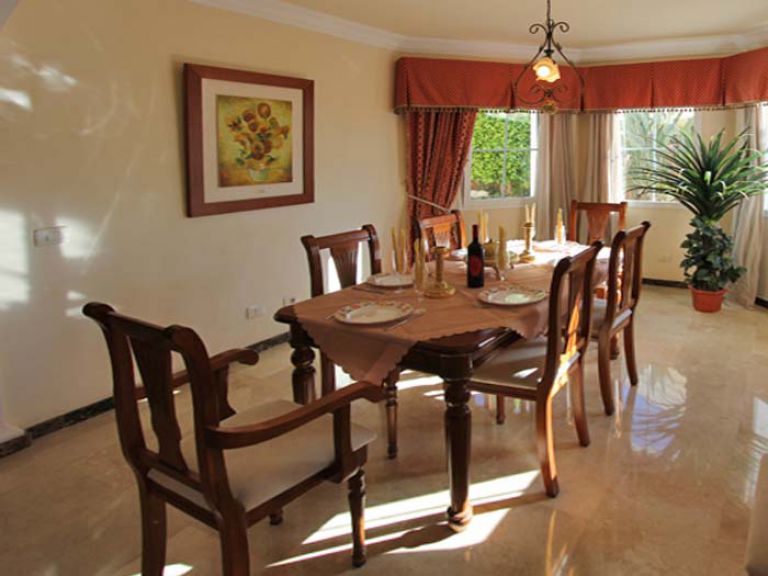 | Die Wohnfläche von ca. 315 qm verteilt sich auf zwei Ebenen und bietet Platz für 4 Personen. Im Erdgeschoß liegt das großzügige helle Wohnzimmer mit einem bequemen Sofa, Sesseln und SAT-TV. Hieran schließt sich der Eßbereich mit einem Eßtisch für 6 Personen an |